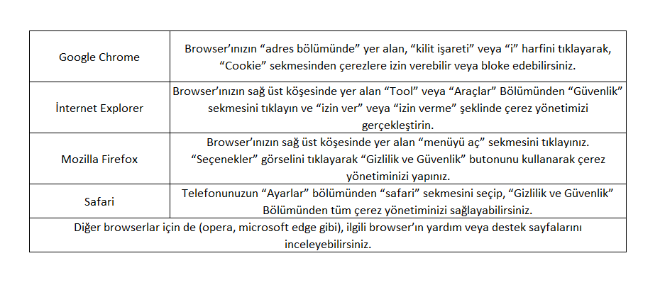 Çerezleri tarayıcılarınızdan silmek isterseniz aşağıdaki taplodan faydalanabilirsiniz.